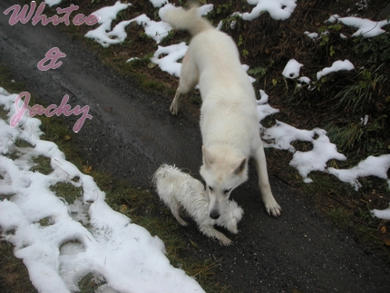 Tento droboučký, avašak svou duší nemalý maltézáček Jacky (s PP) je asi o 2 měsíce mladší než Whitee. Je to úžasný hafík, ikdyž je Whitee několikanásobně větší než on, tohle neohrožené psisko se vůbec nebojí, a stále a stále provokuje ;) miluje svou paničku, které je neustále v patách, ovšem jediná věc bránící jejich lásce jsou malé úzké mosty :D z těch má Jacky opravdovou hrůzu. S paničkou toho mají ještě mnoho před sebou, proto jim oboum držíme palce ;)