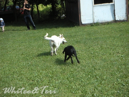 Terinka je černý labík, neuvěřitelně mazlivá a hravá fenečka. Pořád se musí vrtět, musí u všeho být. Svého páníčka má ale opravdu ráda, poslouchá taky krásně. Dřív si s Whitee neuvěřitelně rozuměli, posledních pár cvičáku ji (Teri je přeci jen o něco měnší) ale Whitee přímo terorizuje! Převalí ji na záda, a zahryznutá ji do krku (ale fakt jen lehce!) na ni vrčí...nemyslí to výžně, NIKDY by ji nepokousala (tím sem si jistá!) ale naše Malá bílá dospívá, takže si už vyjasňuje pozice. No uvidíme, snad si to Terinka nenechá líbit a dá Whitee co proto! :)